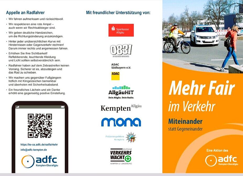 Unser Info-Flyer ist kaum zu übersehen: im typischen "ADFC-Orange" gehalten,eine klassische Situation aus dem Verkehrsgeschehen in Kempten als "eye-catcher" und das Motto "Mehr Fair im Verkehr". In großer Stückzahl wird er in diesen Tagen verteilt.