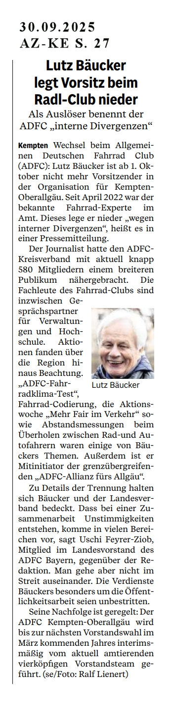 Diese Erfolge haben aber zunehmende interne Divergenzen im Vorstand nicht verhindert. Bäucker ist ab 1.Oktober nicht mehr Vorsitzender des ADFC Kempten-Oberallgäu.(siehe Bericht “Allgäuer Zeitung” 30.9.25)