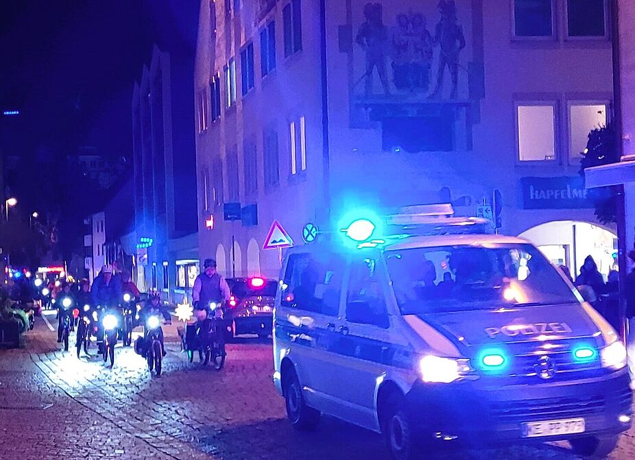 So gerüstet führte ADFC-Organisator Tobias Heilig das strahlende Peloton mit exakt gezählten 53 Teilnehmern und unter Begleitschutz von Erstem Polizeihauptkommissar Andreas Ruepp in die Nacht. Viele der Mitradler hatten die Einladung zur Lichterfahrt in der Zeitung gelesen oder im Instagram-Account des ADFC entdeckt:“ Das ist so eine schöne Veranstaltung,“ schwärmte ein Mitfahrer,“macht Ihr das öfter?“ Machen wir jedes Jahr, wenns dunkel wird in Kempten. Eine erstmals teilnehmende Dame ließ sich detailliert von Tobi über die Strecke quer durch die Innenstadt informieren, unsere ADFC-Aktiven Mario, Uwe , Horst , Stefan und Chrisi geleiteten den Tross sicher durch Kempten, Mark sorgte mit seinem Anhänger für die passende Musikbegleitung .